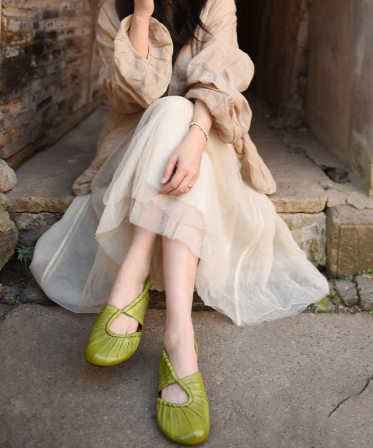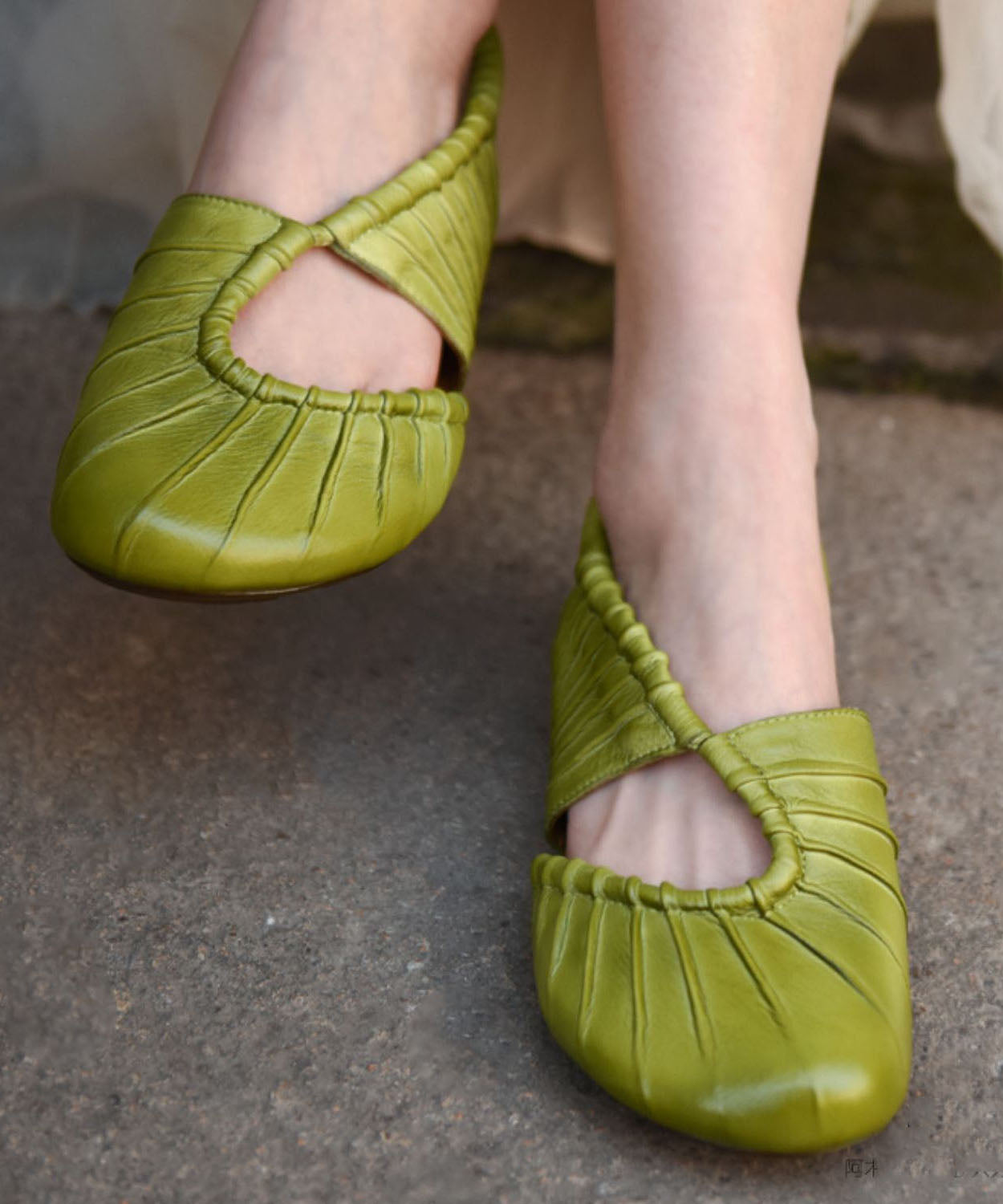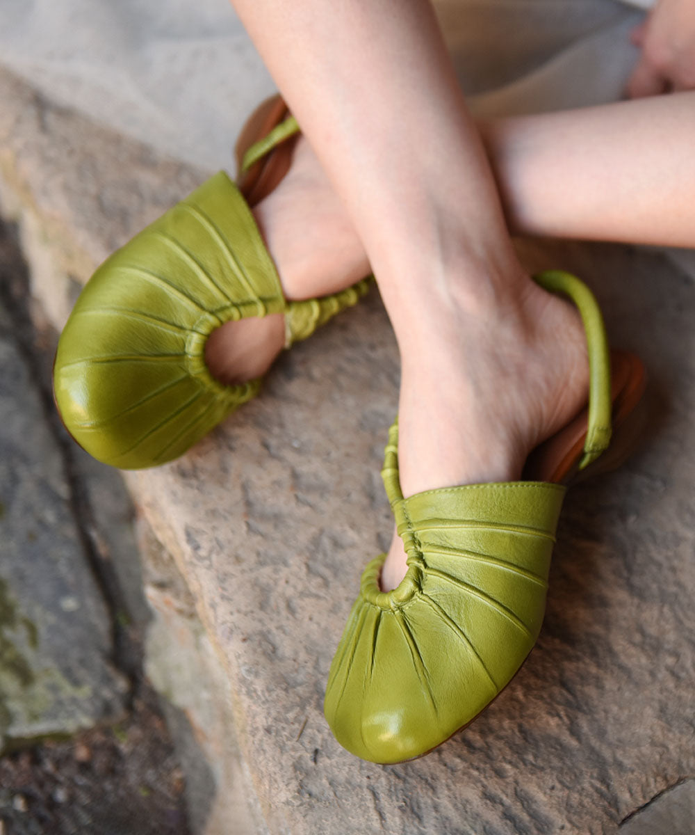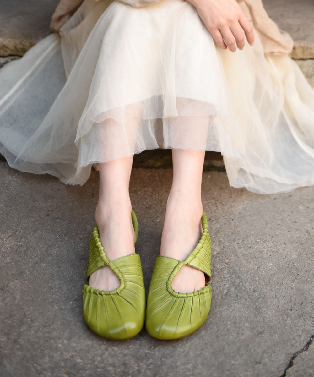 • Beautiful Hollow Out Splicing Chunky Flat Sandals Green Cowhide Leather LY7598